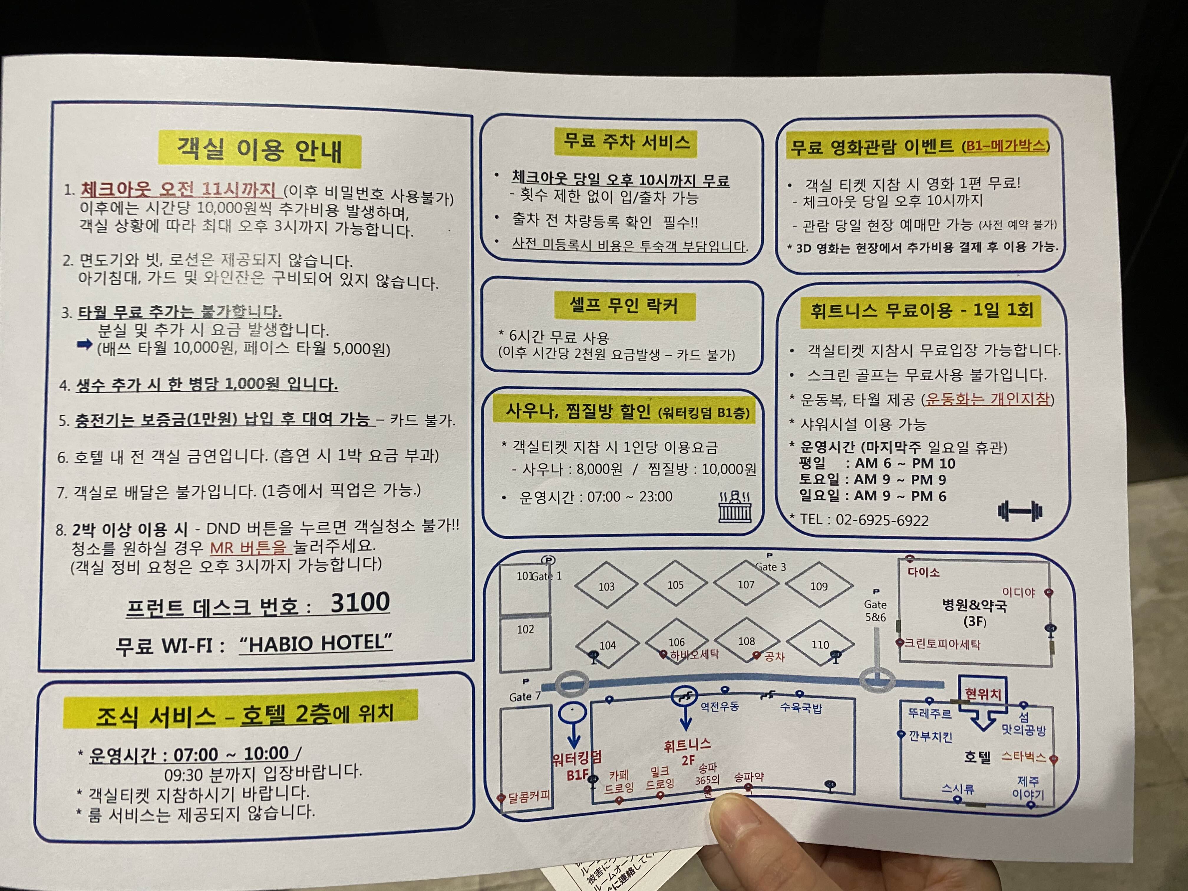 체크아웃시간, 어매니티, 데스크번호, 주차 등 안내사항이 적혀 있고