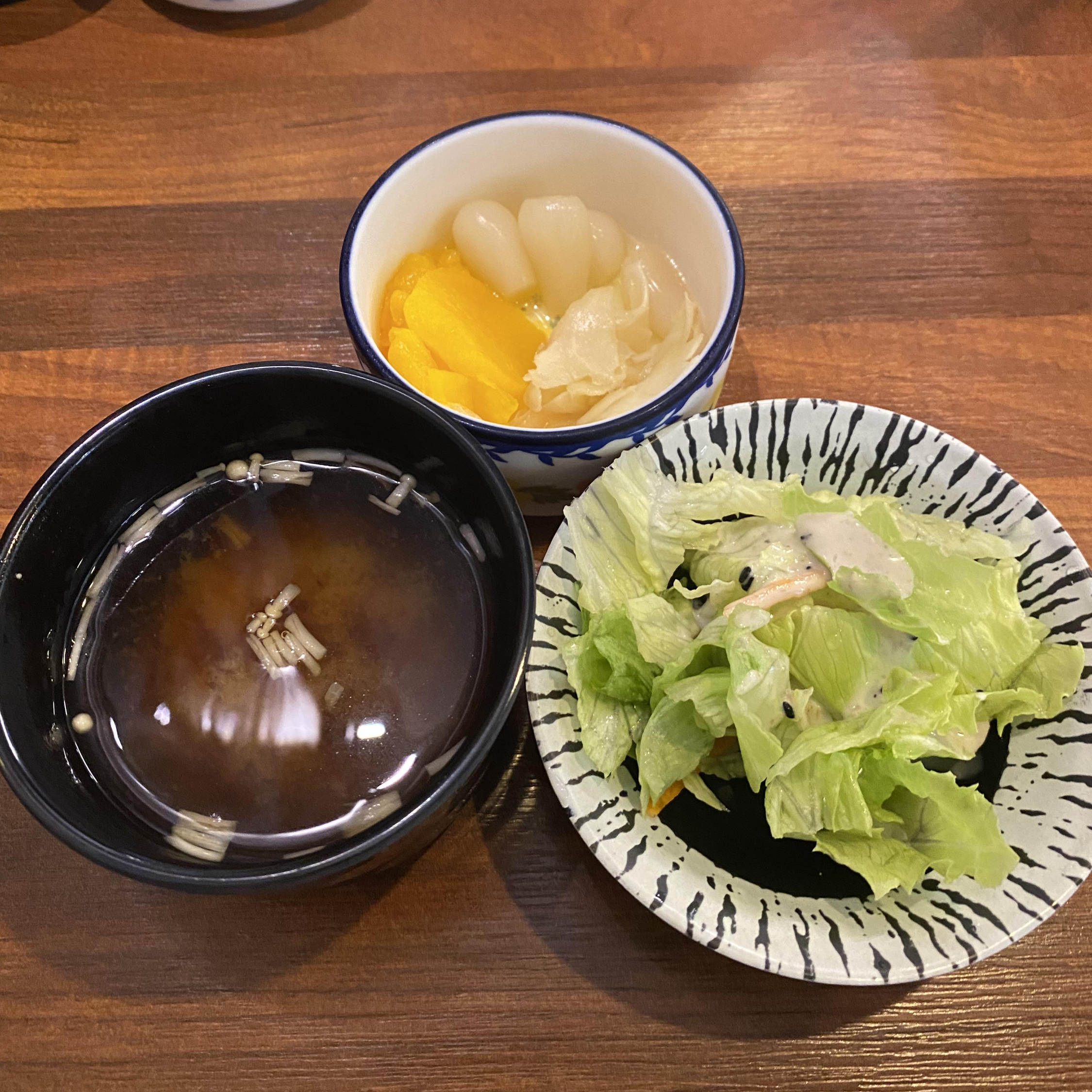 샐러드와 장국, 락교와 생강,단무지가 한 접시에 나온다.
