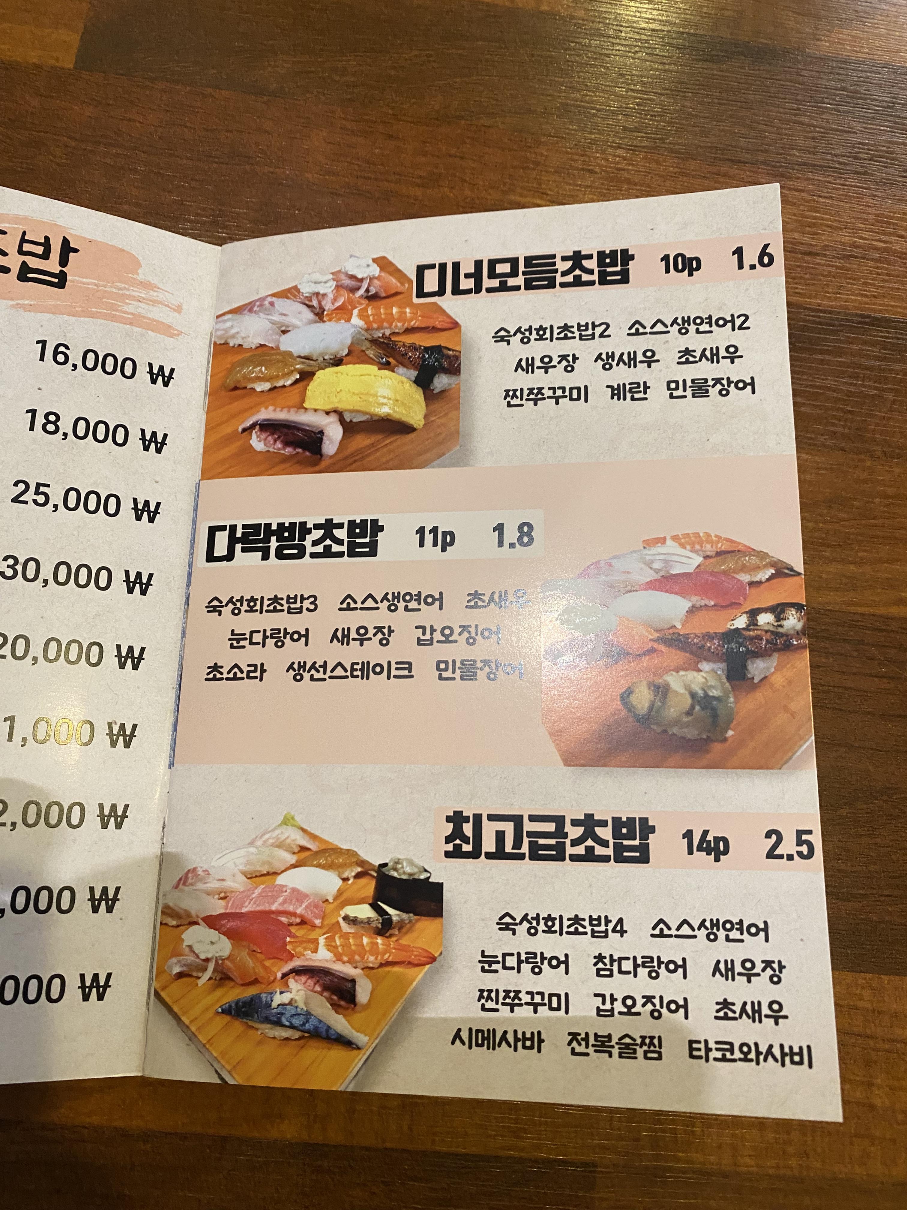 우리는 다락방초밥 11피스(18,000원)과 숙성회초밥 10피스(22,000원)을 주문했다.