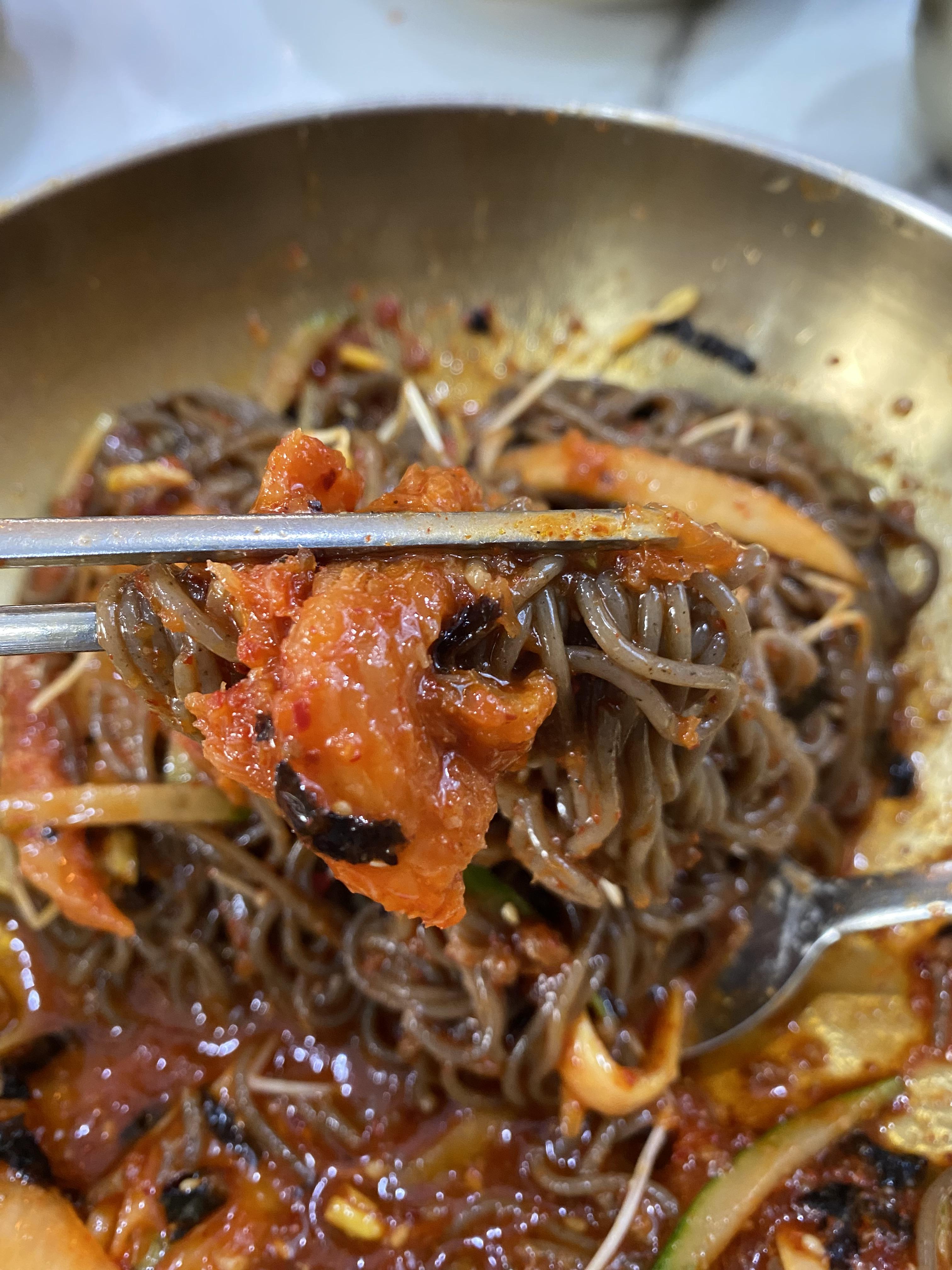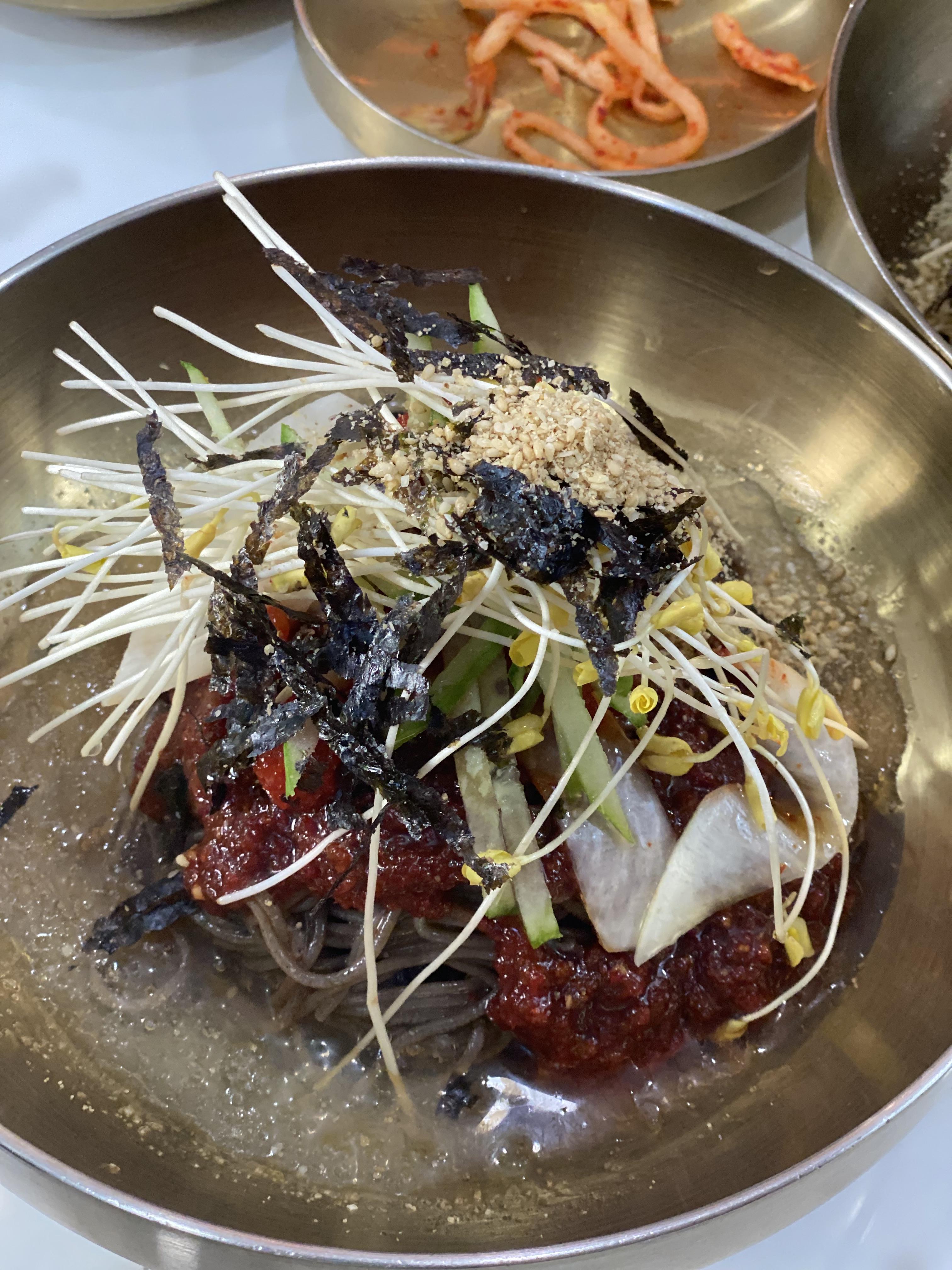 고소하고 쫄깃한 메밀면에 양념장, 명태회무침, 오이, 메밀싹이 올라가 있다. 자작하게 부어져 있는 시원한 육수까지!
