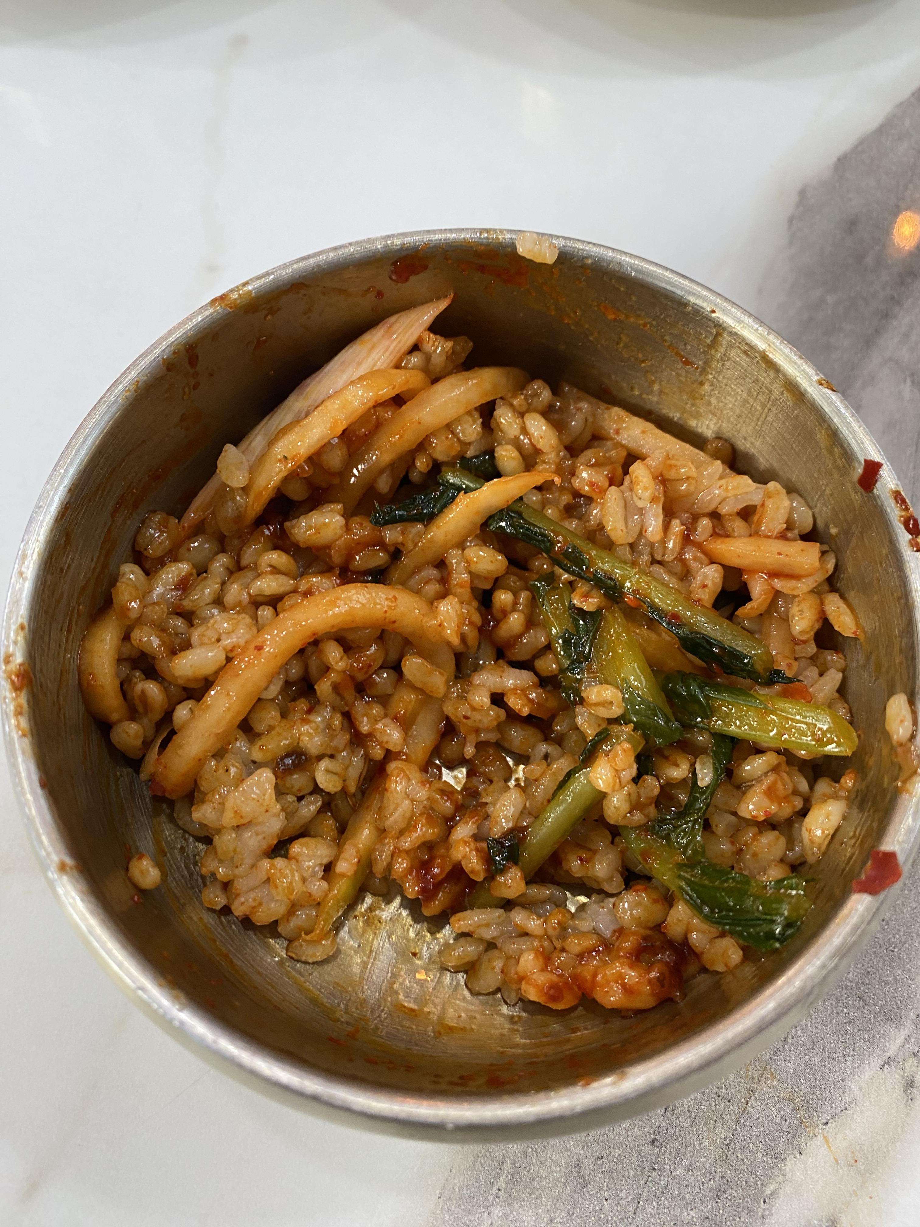 같이 나온 무생채랑 열무김치를 보리밥에 넣고 고추장 슥슥 비벼서 한입 냠~