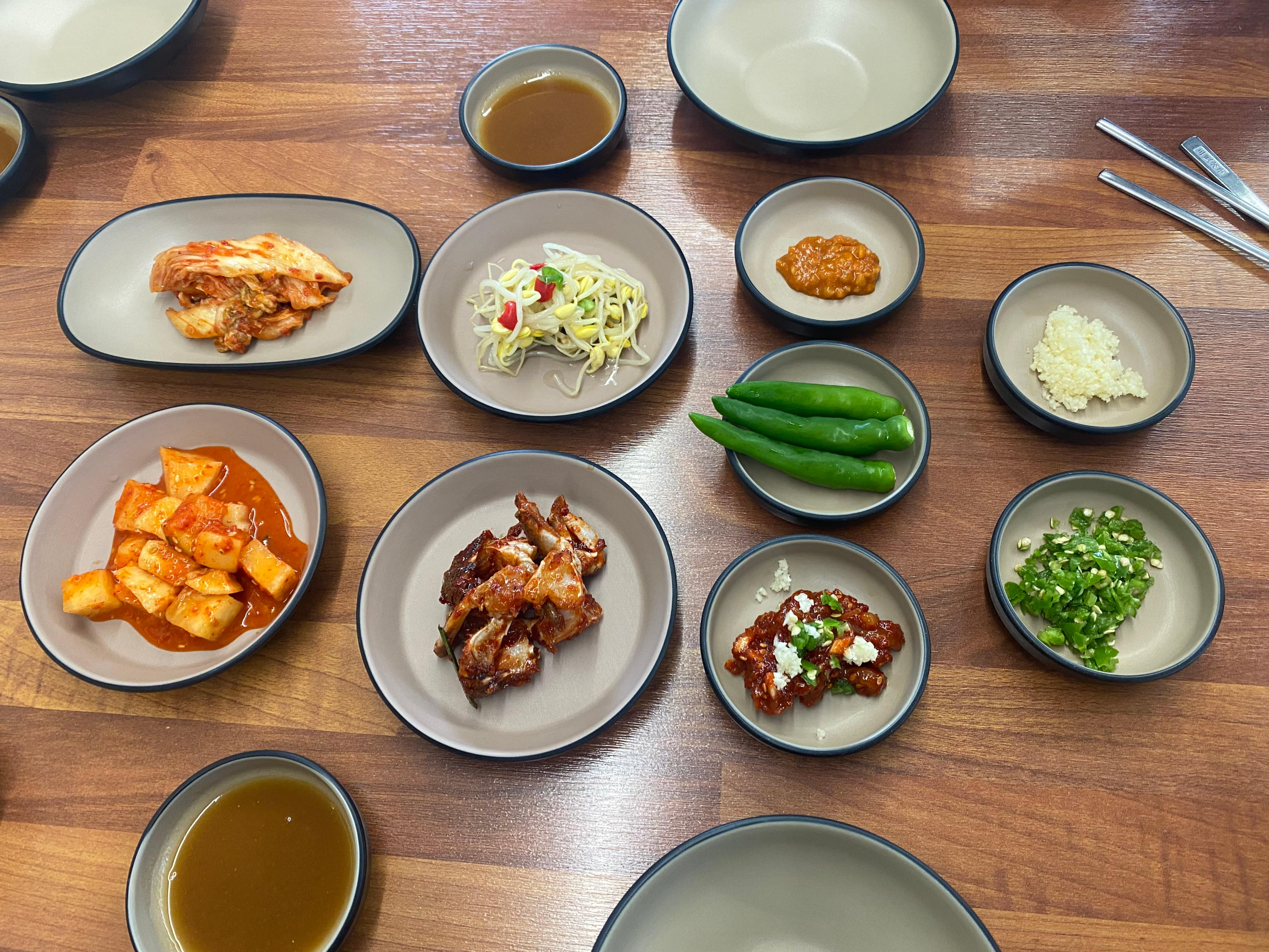 김치, 깍두기, 콩나물무침, 양념게장, 고추, 오징어젓갈, 다진 마늘, 다진 고추가 나온다.