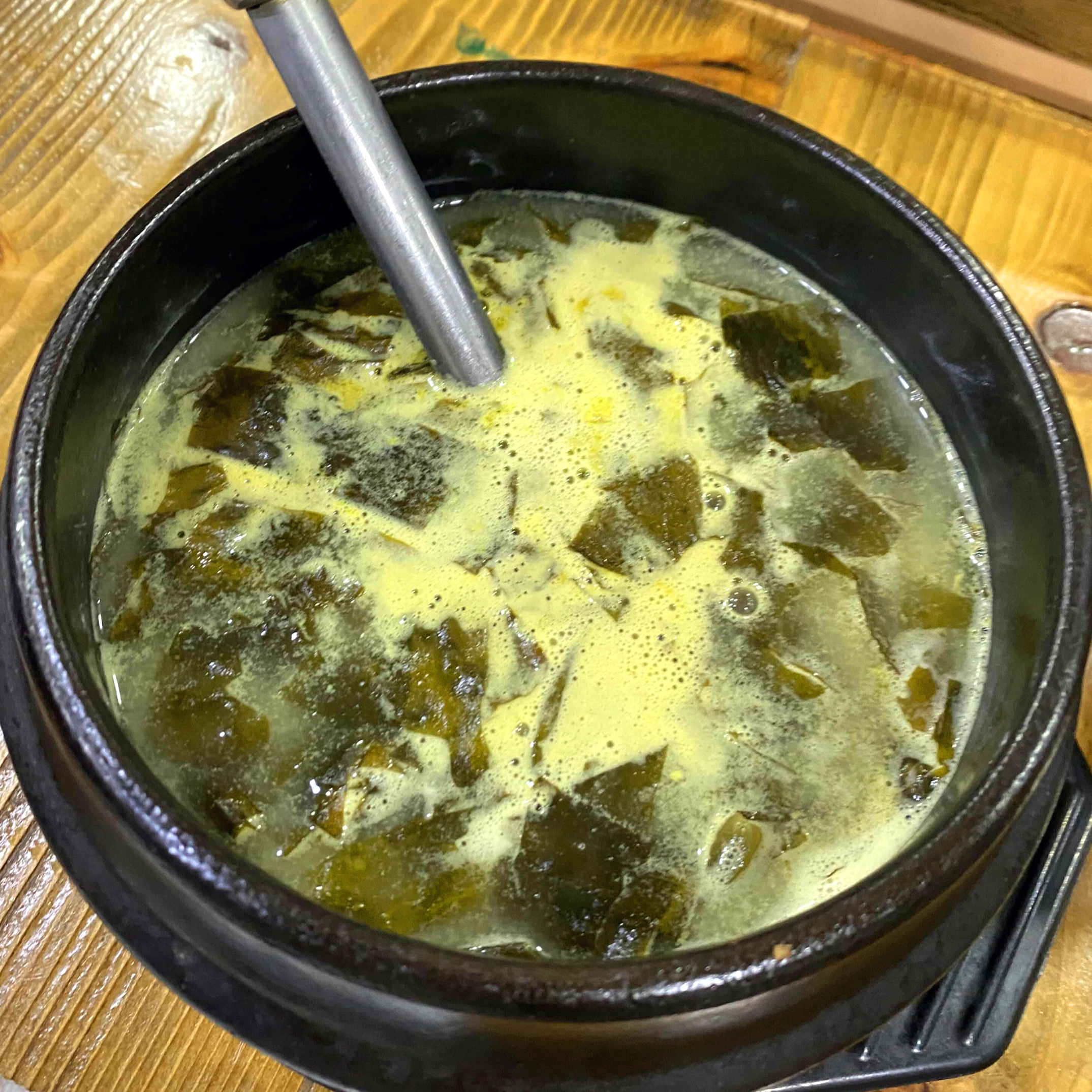 우럭을 넣어 끓인 아주 뽀얗고 걸쭉한 미역국이다.