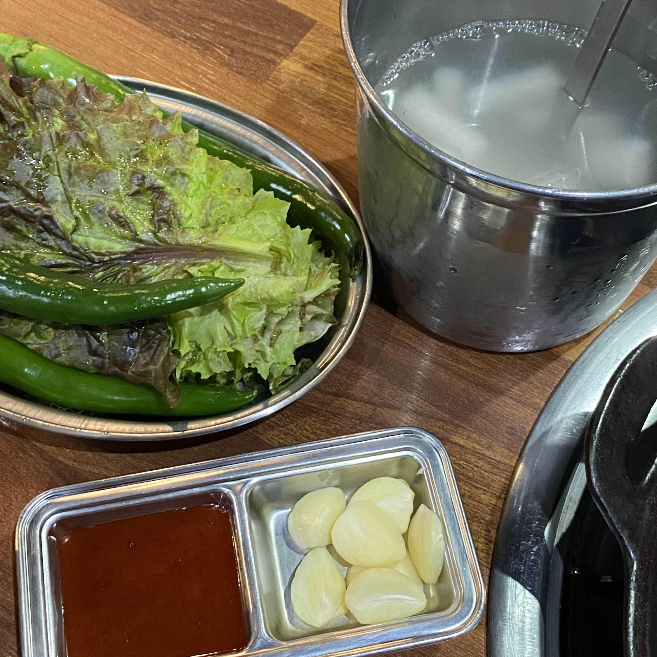 상추에 야채랑 당면, 떡, 곱창 올리고 마늘과 고추 올려 싸 먹고 소주 한 잔 캬~